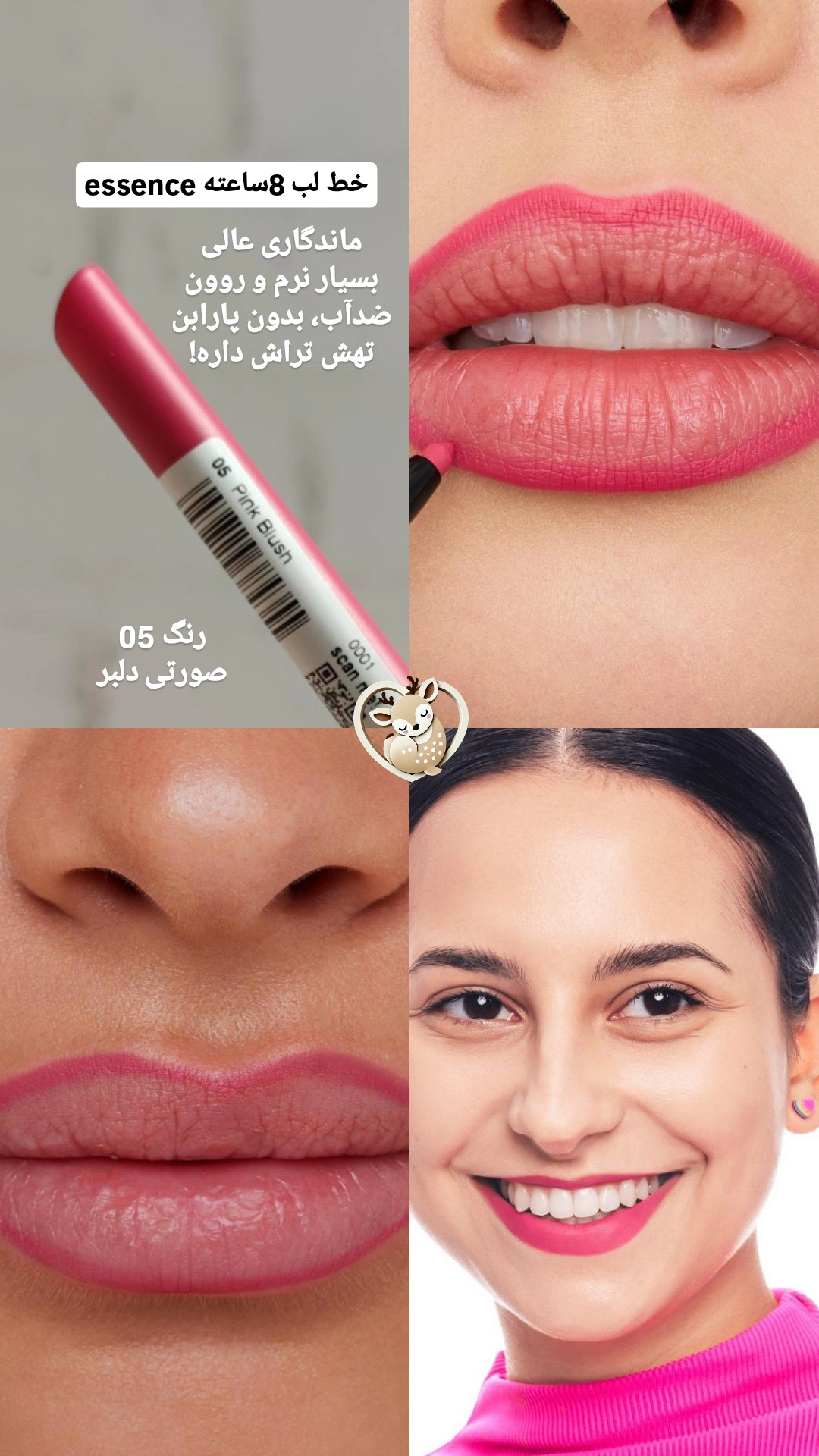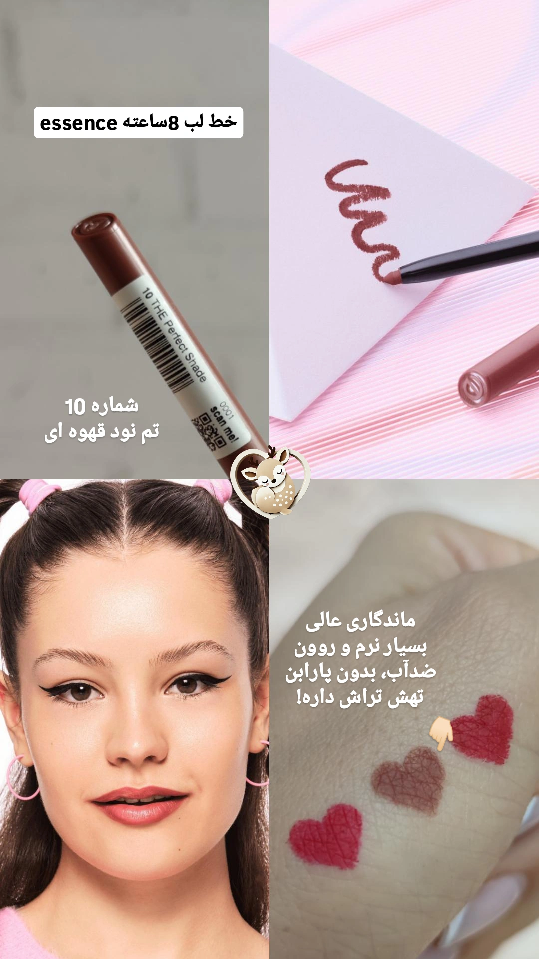 طیف رنگی متنوع در این مداد لب ویژه، به گونه ایست که می توانید رنگ آن را با رنگ رژ لب های خود هماهنگ کنید. ماندگاری بالا و ضد آب بودن مداد لب اسنس، در هنگام غذا خوردن یا در طول روز، از دور لب ها پاک نشده و جلوه ای طبیعی و مات روی لب ها ایجاد می کند.