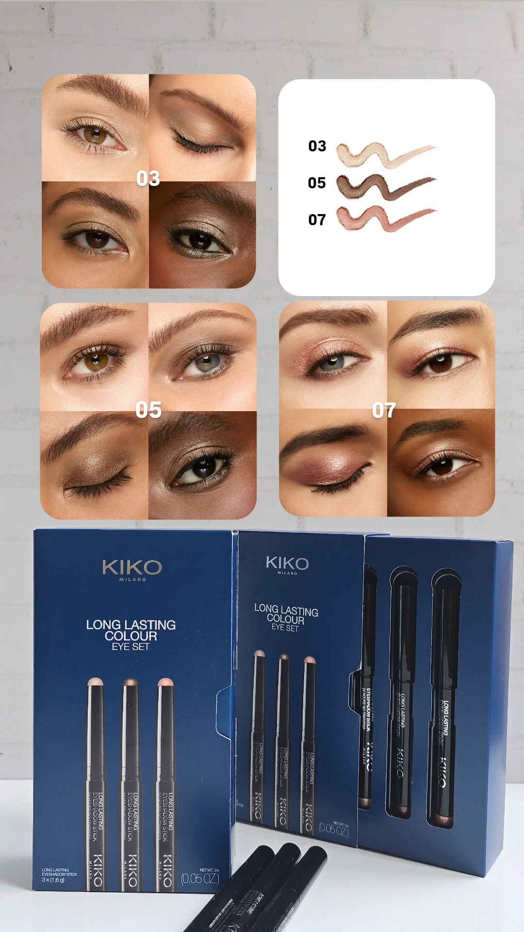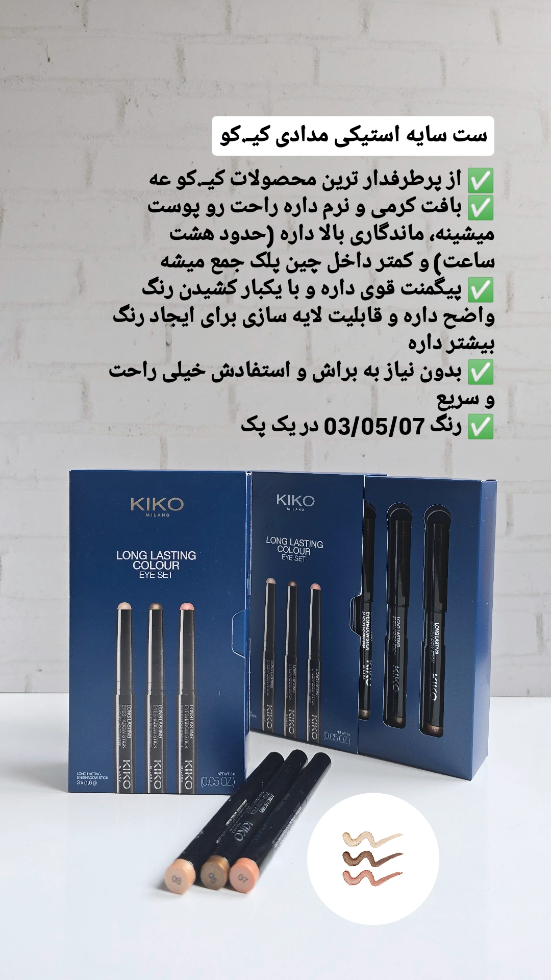 ویژگیهای برجسته ست سهعددی سایه استیکی کیکو مدل Long Lasting Colour (سری 01):