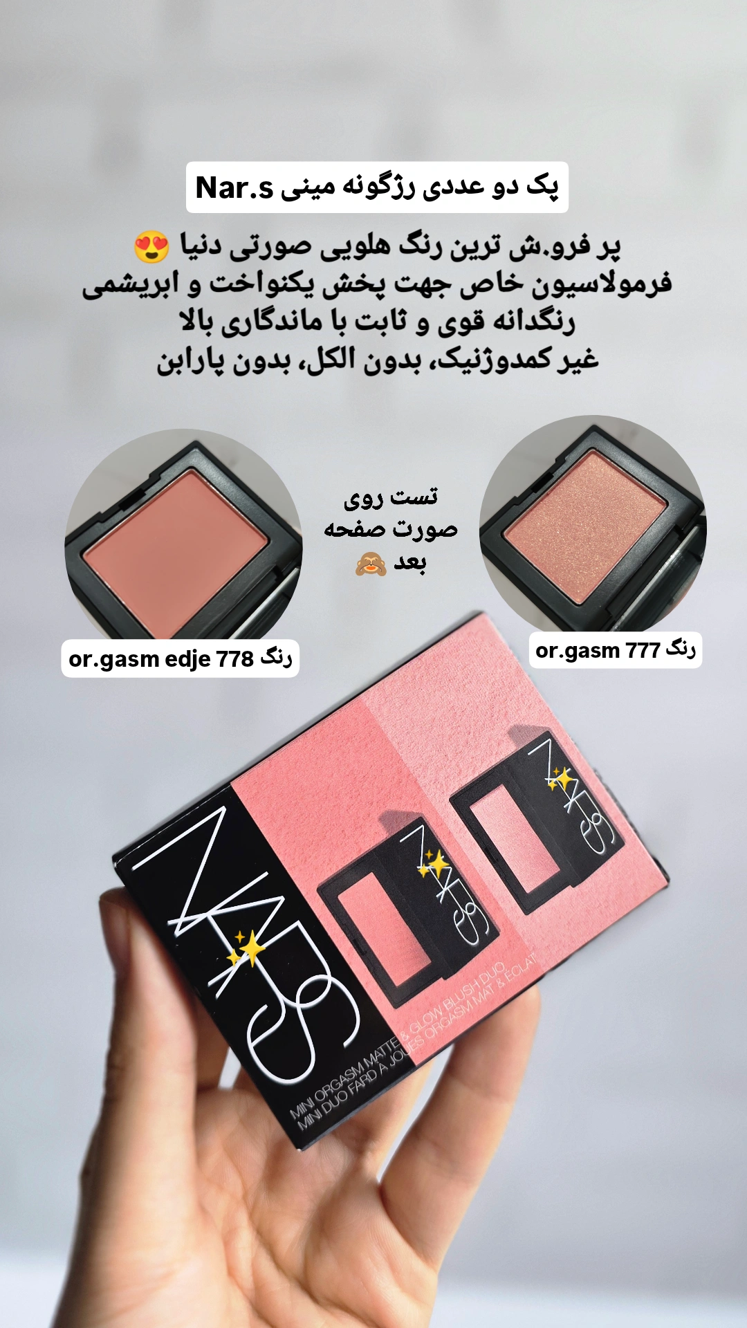 ست رژ گونه مات و درخشان نارس مدل مینى او.رگاسم، ترکیبی از رژگونههای مات و درخشان مدل او.رگاسم این برند است که جلوهای طبیعی و درخشان بر صورت ایجاد میکند. این نسخه مینی از رژگونه او.رگاسم، امکان ایجاد ظاهری سفارشی با استفاده از هر دو فرمول مات و درخشان را فراهم میکند.