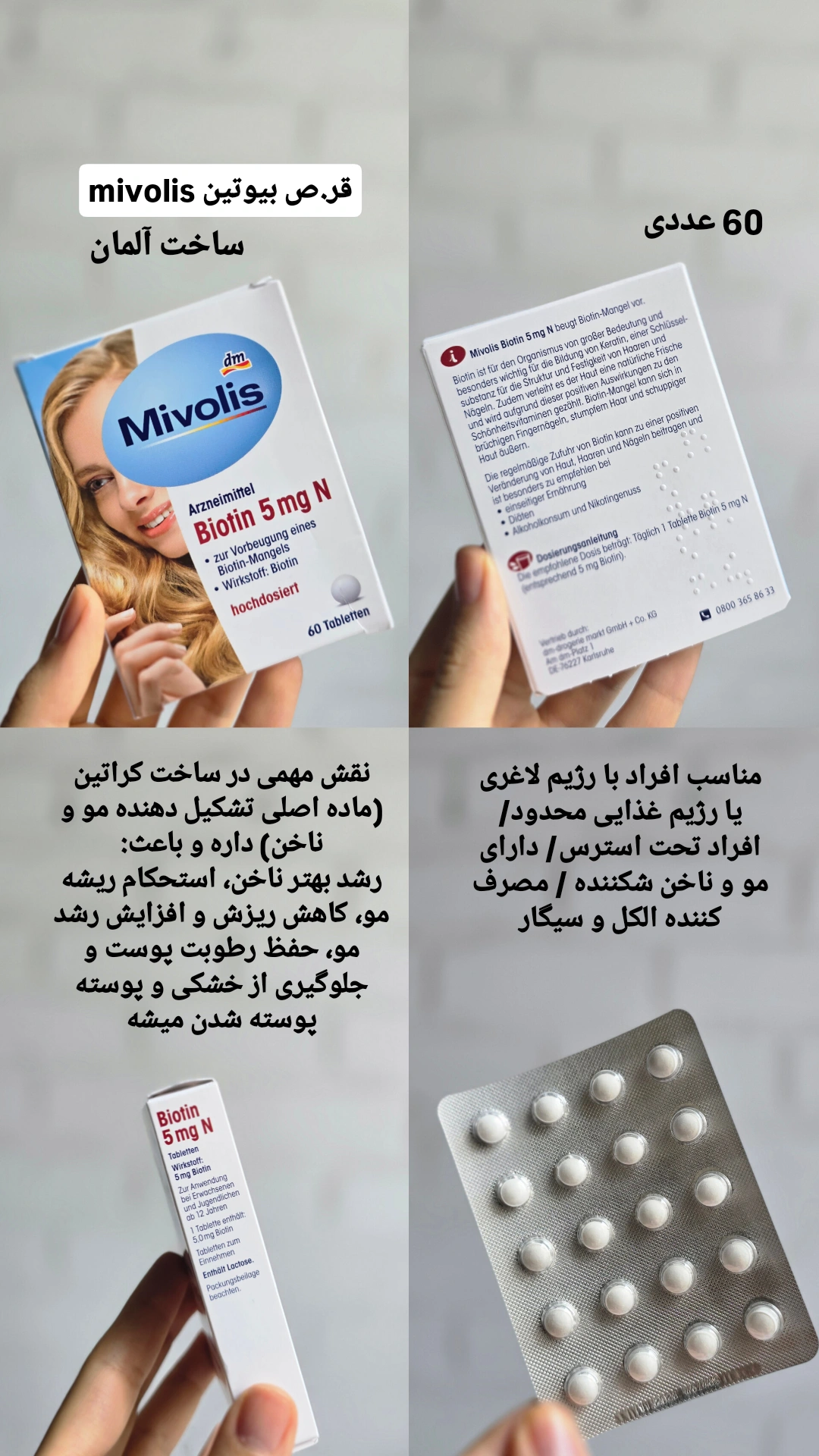 - حاوی ۵ میلیگرم بیوتین در هر قرص