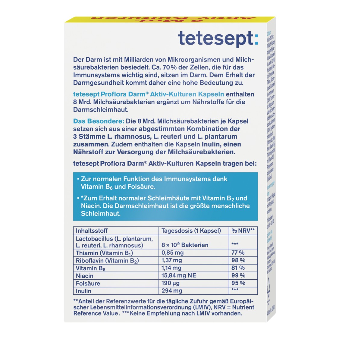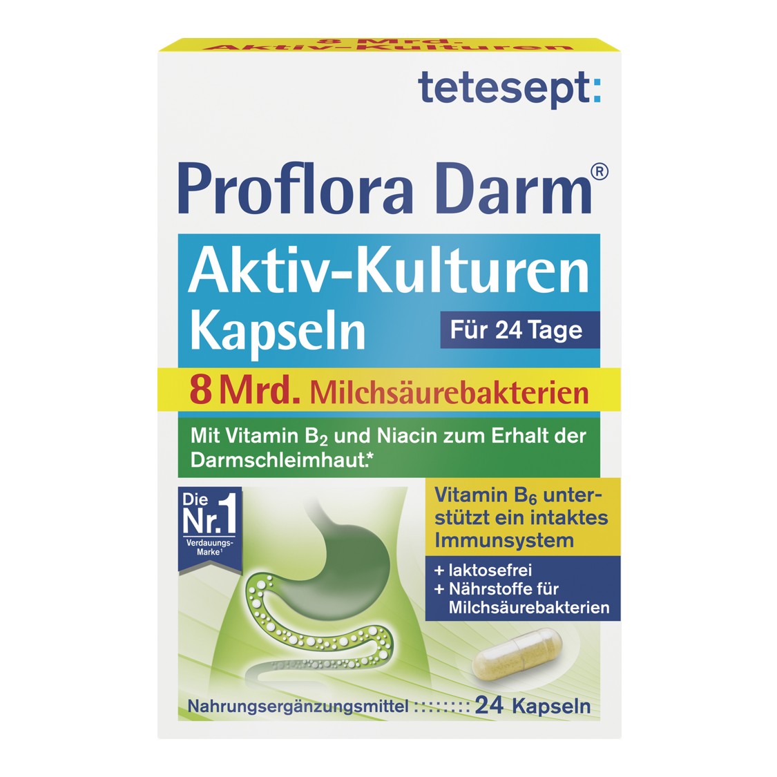 کپسول پروبیوتیک Proflora Darm محصولی از برند معتبر آلمانی Tetesept است که با دارا بودن میلیاردها باکتری پروبیوتیک زنده و فعال، باعث تقویت باکتریهای مفید روده و تنظیم عملکرد سیستم گوارش میشود. این مکمل با ترکیبی از سویههای منتخب پروبیوتیک و ویتامینهای گروه B، نقش مؤثری در کاهش مشکلات گوارشی مانند نفخ و سوءهاضمه دارد و همچنین با بهبود جذب مواد مغذی، به افزایش سطح انرژی و حمایت از سیستم ایمنی بدن کمک میکند. فرمولاسیون این کپسولها بدون گلوتن، لاکتوز و مواد نگهدارنده است و برای استفاده روزانه مناسب میباشد.
